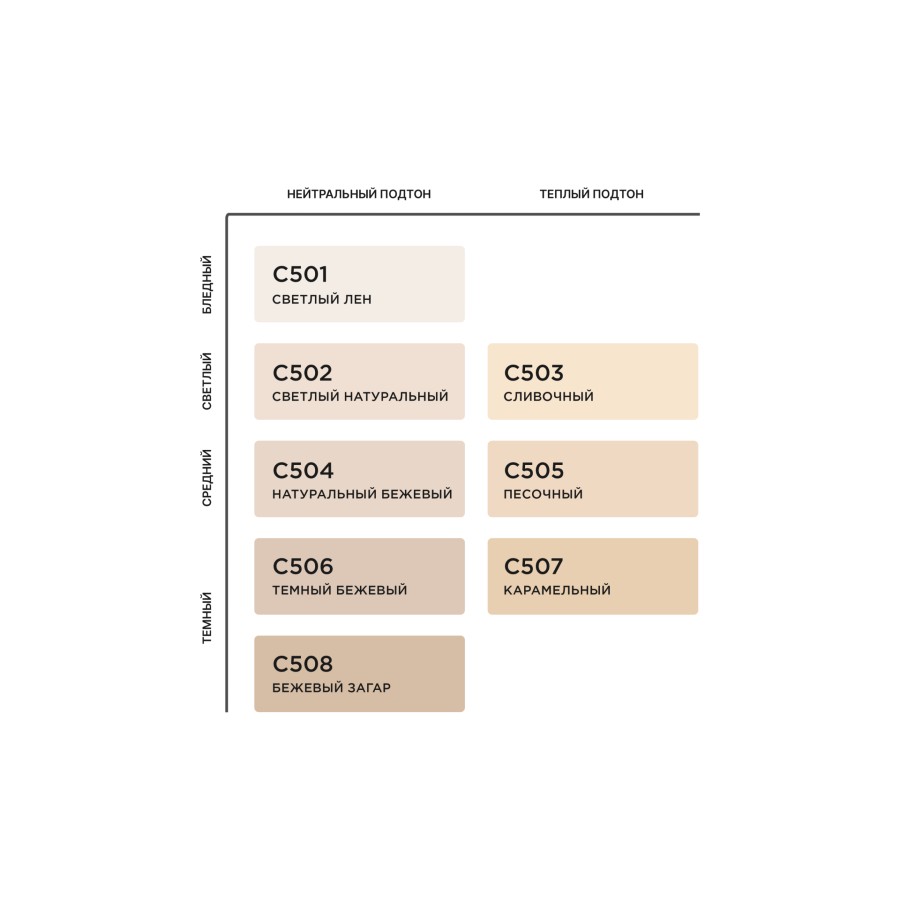 Компактная основа обеспечивает матовый финиш и регулируемую степень покрытия – от средней до плотной. Она выравнивает тон, скрывает несовершенства, придает лицу здоровый и ухоженный вид.